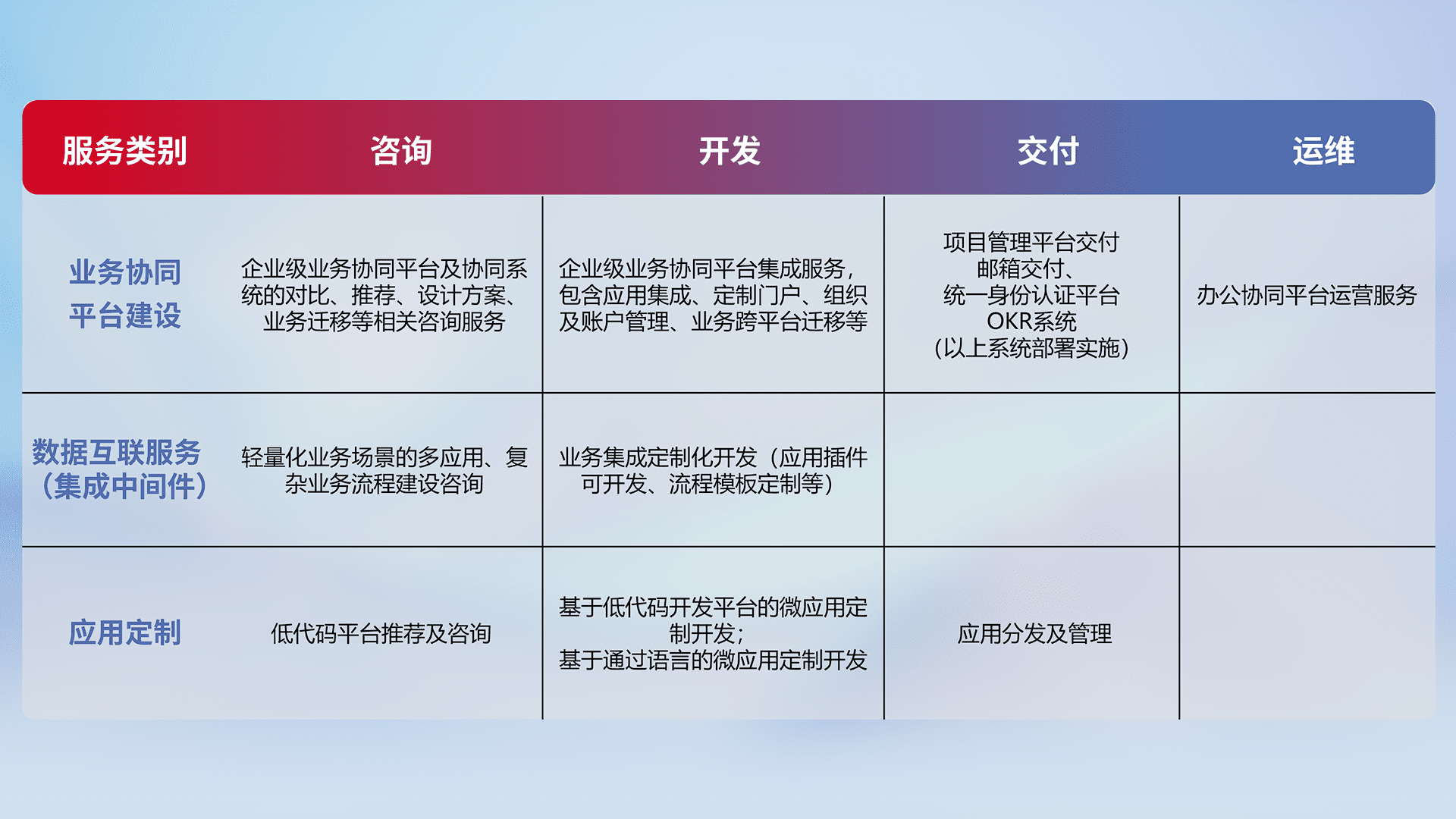 针对钉钉、、企微、、、IDaas等平台级产品提供产品的规划、、方案、、、交付、、定制化开发等服务,,实现如统一协同办公、、、、智能客户服务、、混合会议管理、、智能数据查询、、、等业务场景,,,实现数字化转型。。。。